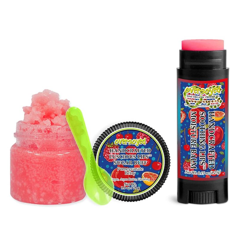 Pomegranate Berry Soothing & Luscious Lips by OverSoyed Exfoliator & Chapped Lip Repair Lip Care Combo | Artisan Handcrafted to Order Sweet Pomegranate Sparkling Citrus Juicy Flavored Exfoliating Sugar Lip Scrub & Lip Moisturizer Balm Gift Set