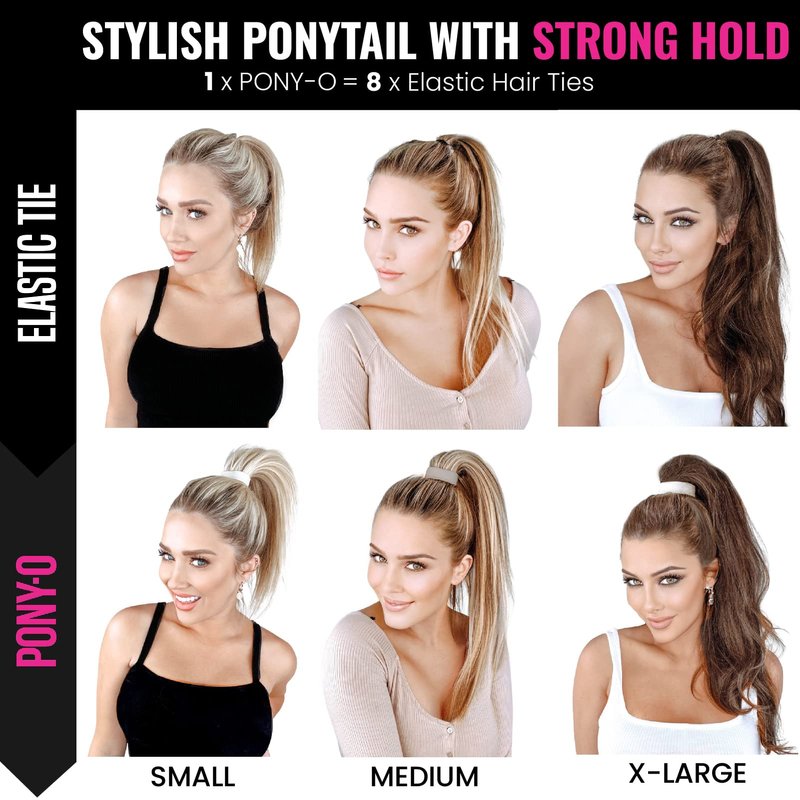 - SIZING GUIDE – Whether you have long, short, fine, thick, curly, or straight hair; we have a PONY-O for you. Choose Small size for super fine or sections of hair for styling, Medium size works for almost all hair types, and X-Large for super thick or heavy hair. Check out the Size Guide video to select the best size for your hair type.