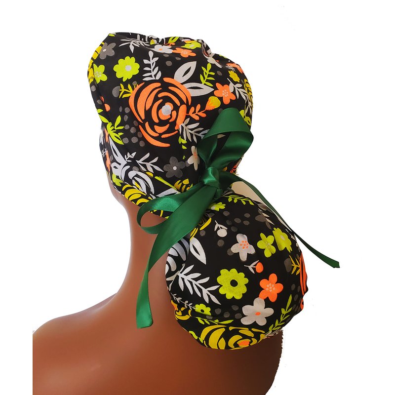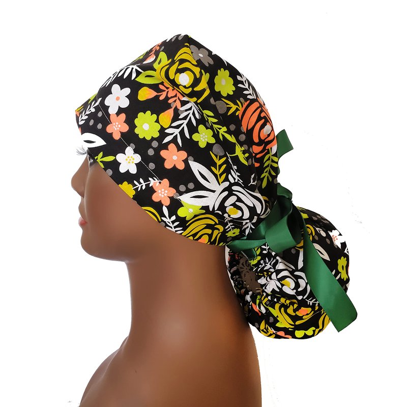 Ponytail Long Hair Covers for Women - Colorful Adjustable Scrub Caps - Cotton Scrubs to Cover Head - Made in USA (Yellow, Orange, and White Flowers on Black Scrub)