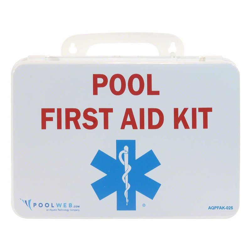 Our Pool First Aid Kits are clearly marked in bold with a blue star of life for easy visibility. Kit is designed for pools and aquatic facilities. The handle has two holes so the kit can be mounted to the wall, if that is your preference. Made especially for the pool deck, the case is made of hard plastic and is waterproof. This kit is equipped to serve 10 - 25 people economically and thoroughly. For small hotel or residential pool areas, the kit provides complete, basic first aid protection. Dimensions: 10.5 x 7.25 x 2 inches.