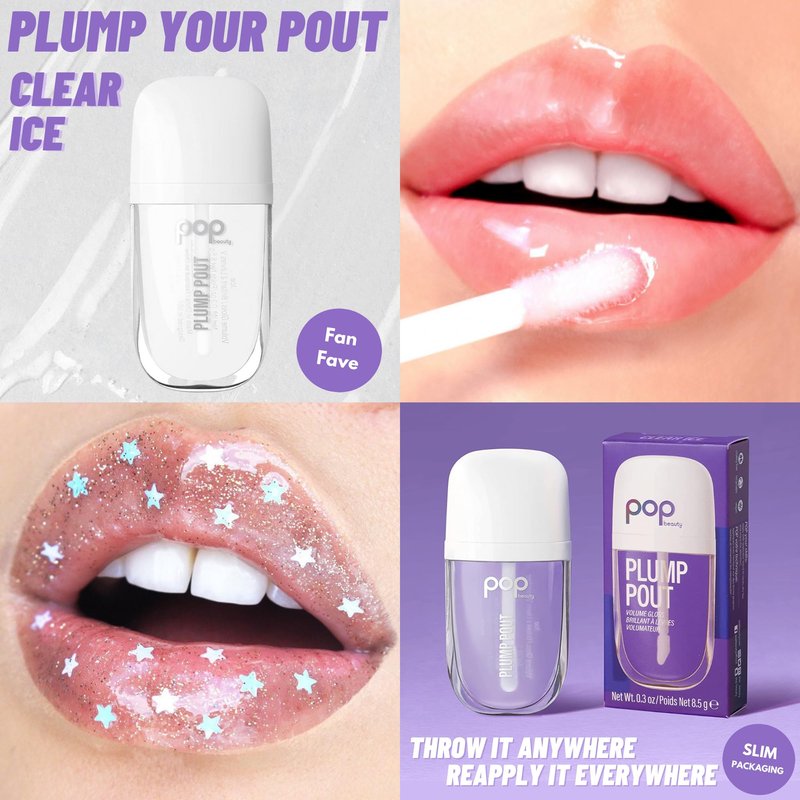 POP Beauty Plump Pout Clear Ice | Plumping Lip Oil, Hydrating Lip Gloss, Long Lasting Nourishing Lip Glow Oil Non-sticky