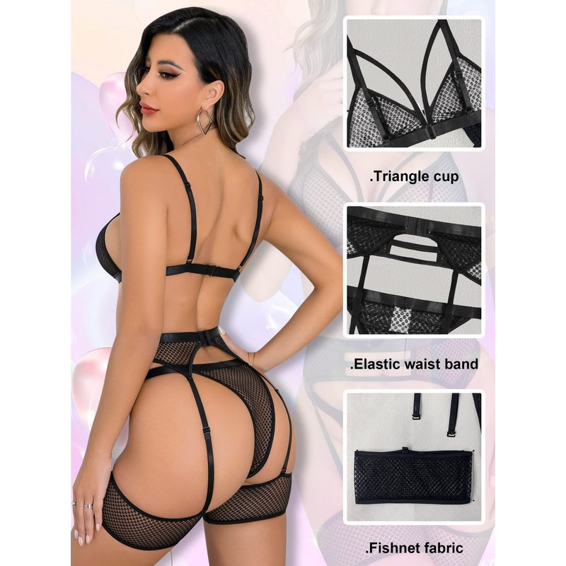 popiv Women's Fishnet Lingerie Sexy Set Lace Bra and Panty Sets with Garter Belt 4 Piece