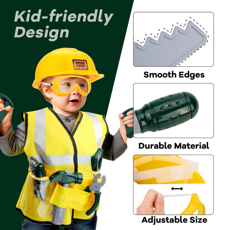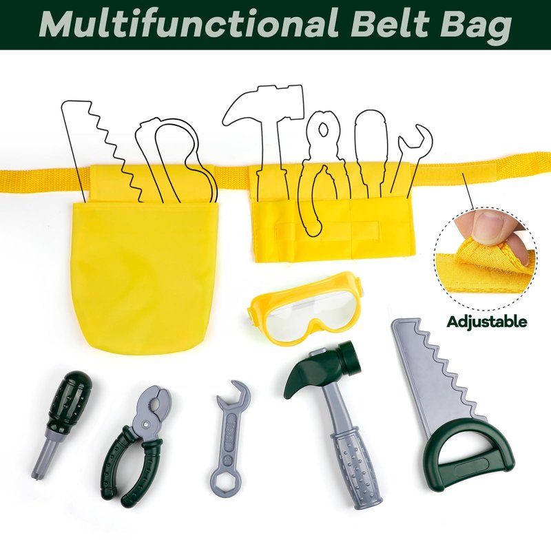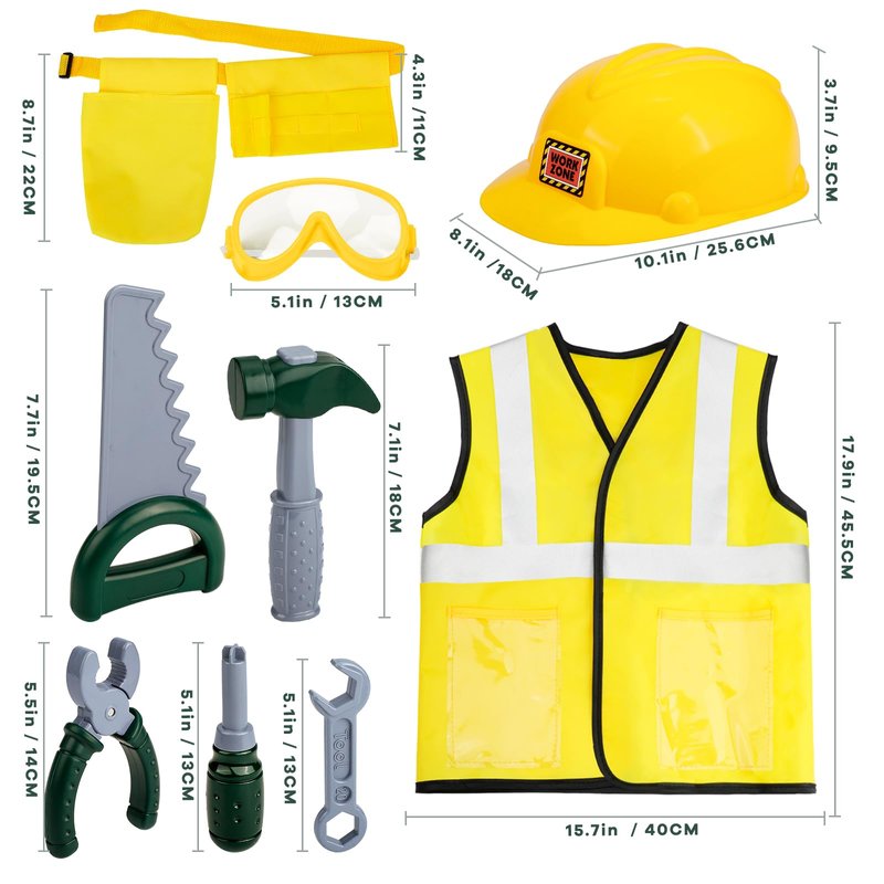 - Complete Construction Toys: Elevate playtime with our kids' tools costume set, featuring a construction vest, helmet, saw, goggles, hammer, vise, screwdriver and adjustable tool belt, ensuring a complete, immersive career experience for little builders