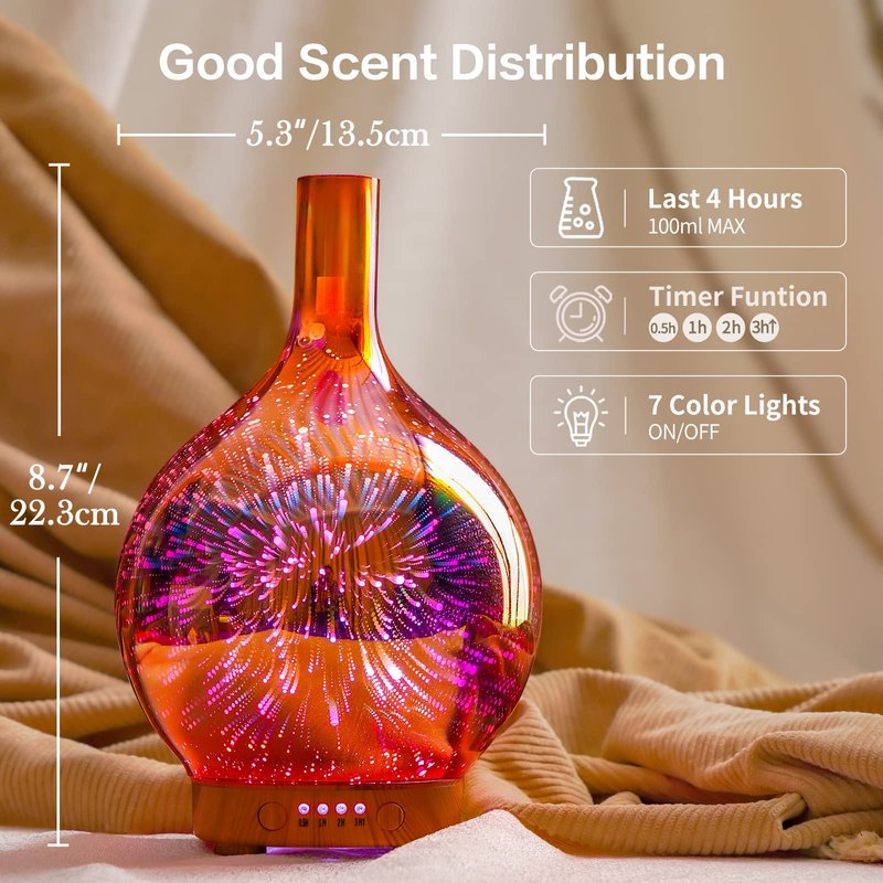 - UNIQUE ART DECORATIVE DESIGN - Our 100ml glass essential oil diffuser has a firework 3D effect glass cover and wood grain decorative base. It is very suitable for your bedroom, living room, children's room, study room, office, and yoga room.