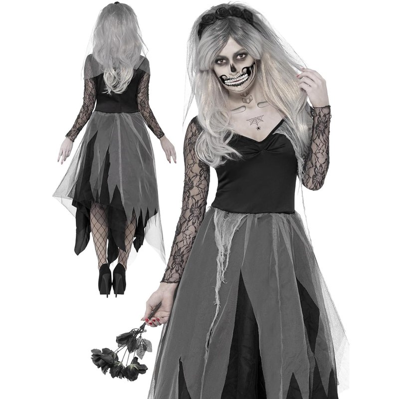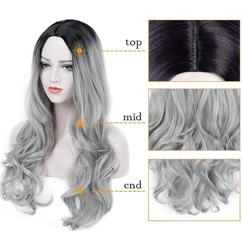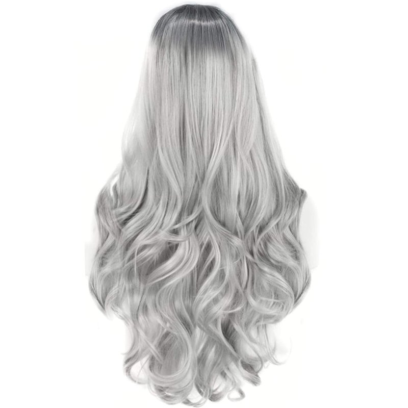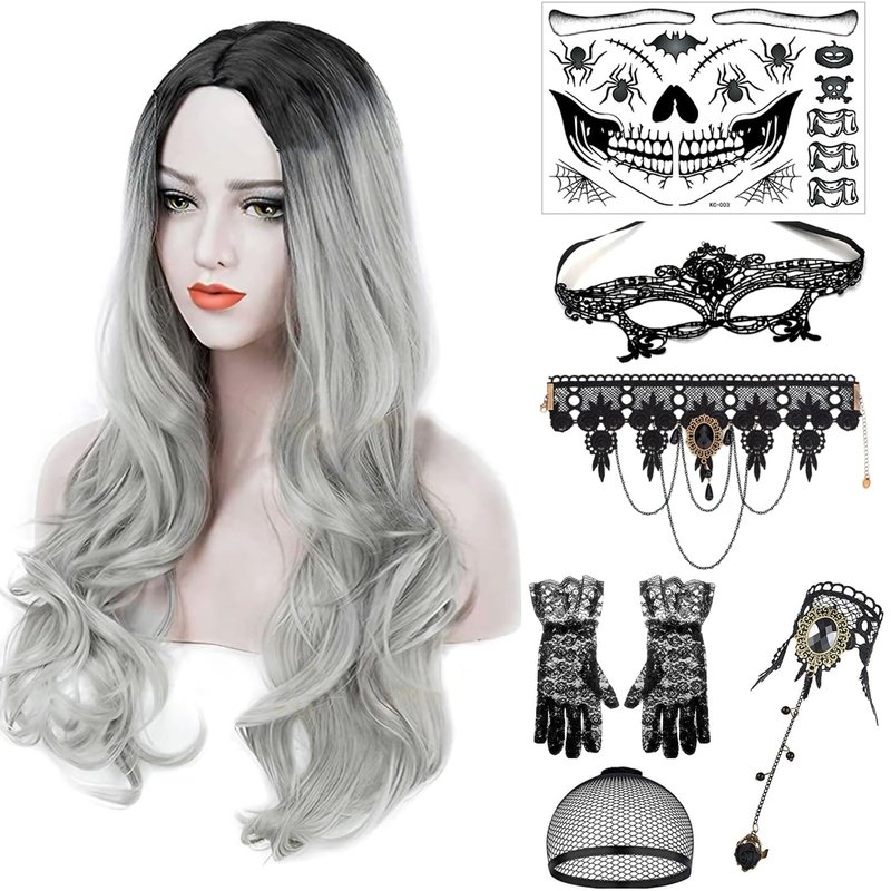 PORSMEER Gray with Dark Root Wig Long Wavy Wigs for Women, Cosplay Synthetic Hair Wig Middle Part Ladies Wigs 7-piece set including Grey Wig+Wig Cap+Lace Mask+Bracelets+Necklaces+Gloves+Tattoo