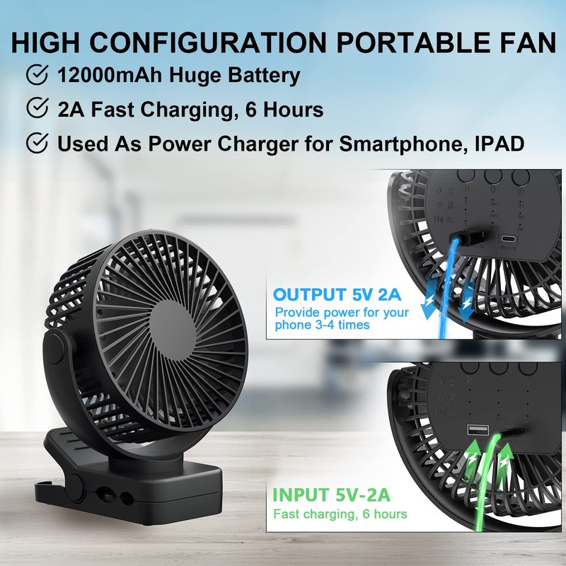 - 【Rechargeable Fan with Timer Switch, Incredible 60 Hours of Battery Life】Our clip on portable fan has timer setting. Our battery powered fan built-in 12000mAh battery, 3 adjustable high-medium-low wind works 12hrs-30hrs-60hrs. Combine with the timer switch(2/4/6 hours), auto turn off the small fan in time to save battery, so you will feel like this usb fan can work forever indoors and outdoor. 5V-2A fast charging helps the electronic cordless fans can be fully charged within 6 hours!