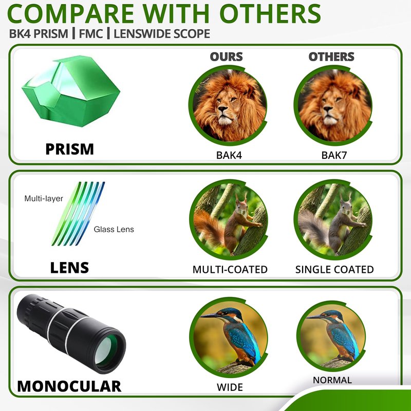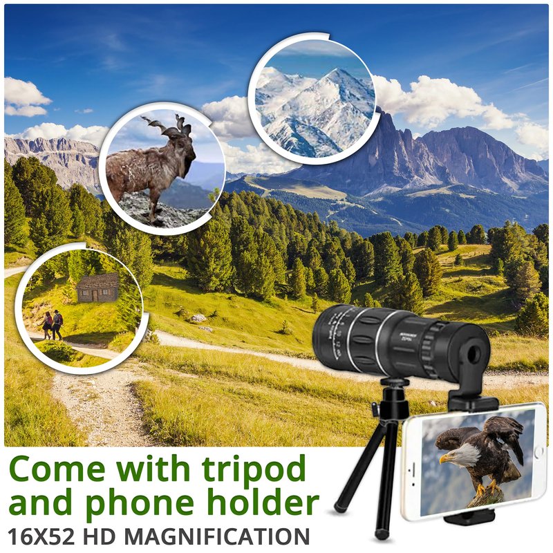 High-Power HD Vision - Dive into the world of unparalleled clarity with our high-power HD vision monocular scope built with superior BAK4 prism and enhanced with fully multi-coated green lens. Designed meticulously to serve the needs of bird watchers, hunters, and star gazers, this piece of art ensures that even the most distant subjects are brought closer in vivid detail. Smartphone Compatible - But why just view when you can capture? Seamlessly attach the monocular to any Android or iPhone with our versatile attachment and elevate your photography. It also comes with a solid tripod for stable viewing and recording. Adaptable Focus - Our monocular is designed for dynamic viewing, equiped with dual focus design with an easily adjustable focus dial and an eye cup which allows optimal viewing even while wearing glasses. Whether you're trying to snap a distant landscape, a rare bird, or a celestial wonder, our monocular provides a unique perspective to share with the world. Shifting your view from a distant bird to a sprawling landscape is no challenge, thanks to the adaptable focus that offers smooth transition for evey sight. Compact, Lightweight, Weather-Proof - Our telescope's compact and lightweight design ensures it becomes your trusty companion on every trip. It's thoughtfully designed to fit snugly in your pocket or backpack, ensuring you're always ready to capture the moment, even with one hand. When your kids are using it for camping, outings, sports activites, concerts or bird watching, given its solid build and light-weight, I am sure they can enjoy the experience to the fullest, even when exposed to rain and sun. Versatile Use - Furthermore, it's not just the seasoned enthusiasts or pro who benefit. The intuitive design ensures it's a hit with kids exploring their surroundings or adults on nature trails. From nature's splendours to concerts or stargazing, this monocular telescope is an invaluable tool for viewers of all ages at all occasions!