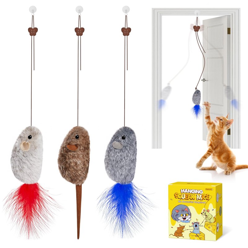 Potaroma Hanging Cat Mice Toys 3 Pcs with Squeaky Sound, Interactive Cat Teaser Retractable, Cat Toys Indoor Kitten Play Chase Exercise, Mental Physical Stimulation