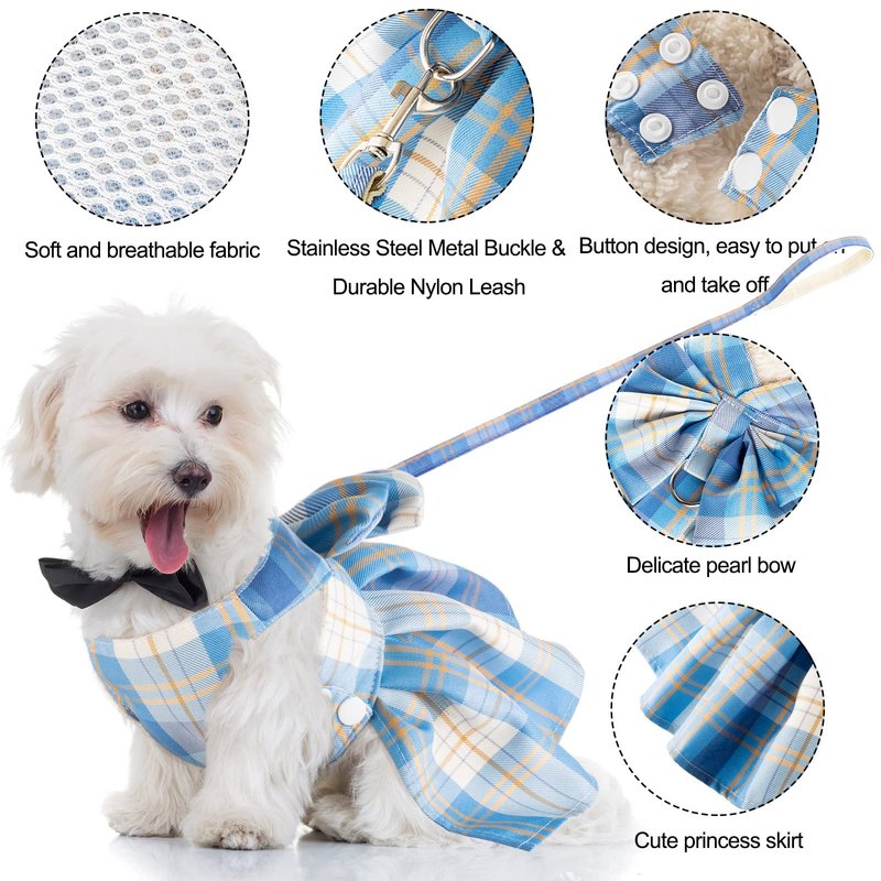 Potchen 4 Pcs Plaid Dog Dress Bow Tie Harness Leash Set Harness Dress for Small Dogs Cute Dog Pet Girl Puppy Summer Clothes for Female Summer Bunny Rabbit Clothes Yorkie Chihuahua Training Walking (S)