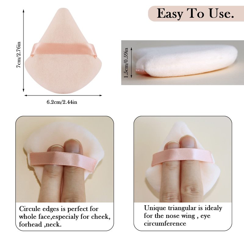 - Easy To Makeup Without Dead Ends: Unique triangular Design of this powder puff is idealy for the nose wing , eye circumference .Circule edges is perfect for whole face,especialy for cheek,forhead ,neck.Meet all your makeup demands easily,perfect for foundation, cream, concealer, blusher, powder, highlighter.