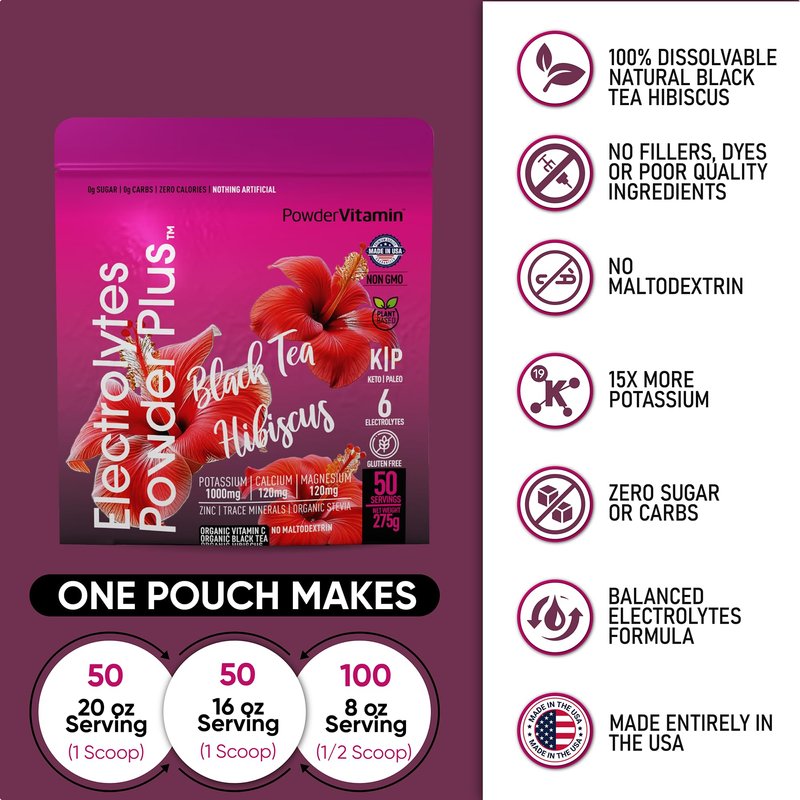 - Electrolyte Powder: Electrolytes Powder Plus contains 1000 mg of potassium opposed to only 250 mg in other brands. Additionally, we offer a unique flavor and blend of Magnesium, Calcium, Pink Himalayan salt. Our delicious and hydrating blend of Black Tea Hibiscus flavor includes 50 servings.