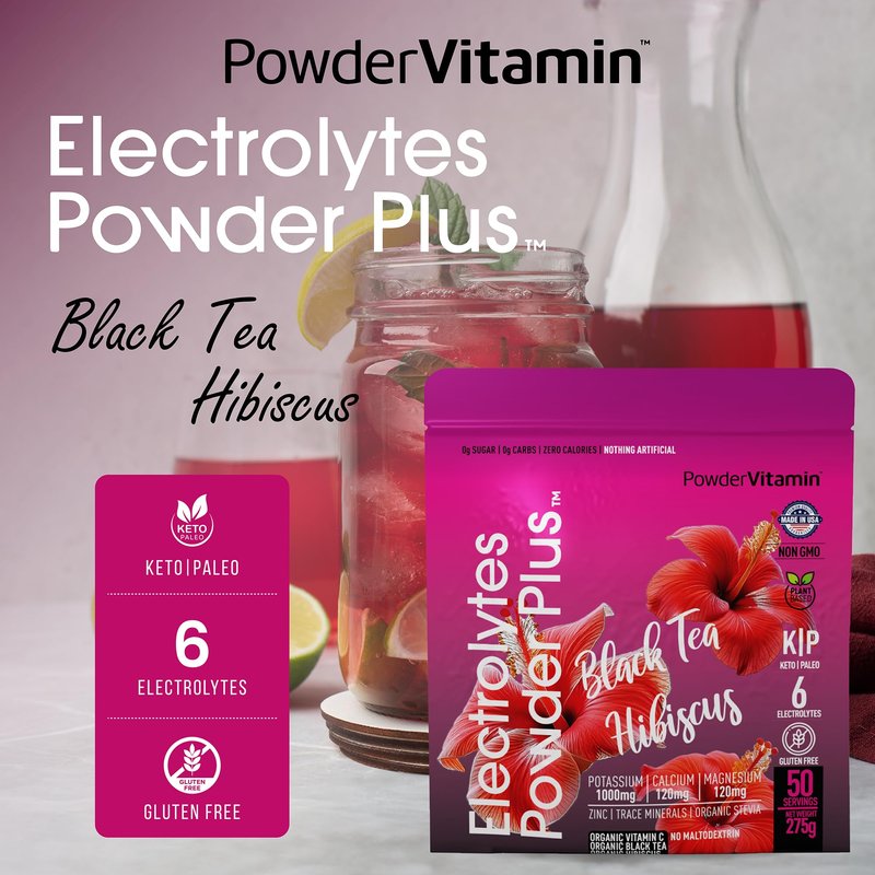 The Key to Keto Success Stay hydrated and ensure proper cell function after a day in the sun or a night on the town. PowderVitamin Electrolytes Powder No-Sugar Drink Mix naturally replaces mineral salts that your body lost while sweating over the lawn mower or partying with friends. This aids in post-workout recovery and promotes nausea and headache relief. Our Black Tea Hibiscus-flavor electrolyte drink mix is a tasty and guilt-free way to stay hydrated and avert dizziness, nausea and other symptoms of keto flu. No Fillers or Additives Our no-sugar electrolyte powder is free of maltodexotrin, a claim that many other electrolyte drinks cannot make. It also contains many key vitamins and minerals so it does the work of a potassium supplement and magnesium supplement. Stabilize daily energy levels, receive important immune support, and stay hydrated for peak physical and mental performance with everything you need and nothing that you don't. Each 275-gram resealable pouch of PowderVitamin Keto Electrolyte Powder makes 50 servings. Made in the USA This electrolytes no-sugar hydration powder is manufactured at FDA-compliant, GMP-certified facilities for your peace of mind. It contains 100-percent clean magnesium citrate, potassium citrate, and organic Vitamin C + zinc, with no artificial flavors, fillers or chemicals. This makes it ideal for occasions when you need fasting electrolytes. Simply stir 1 scoop into water until dissolved and enjoy. Deliciously re-hydrate without calories or sugar. Add PowderVitamin Electrolytes Keto Powder Plus to your keto drinks today.