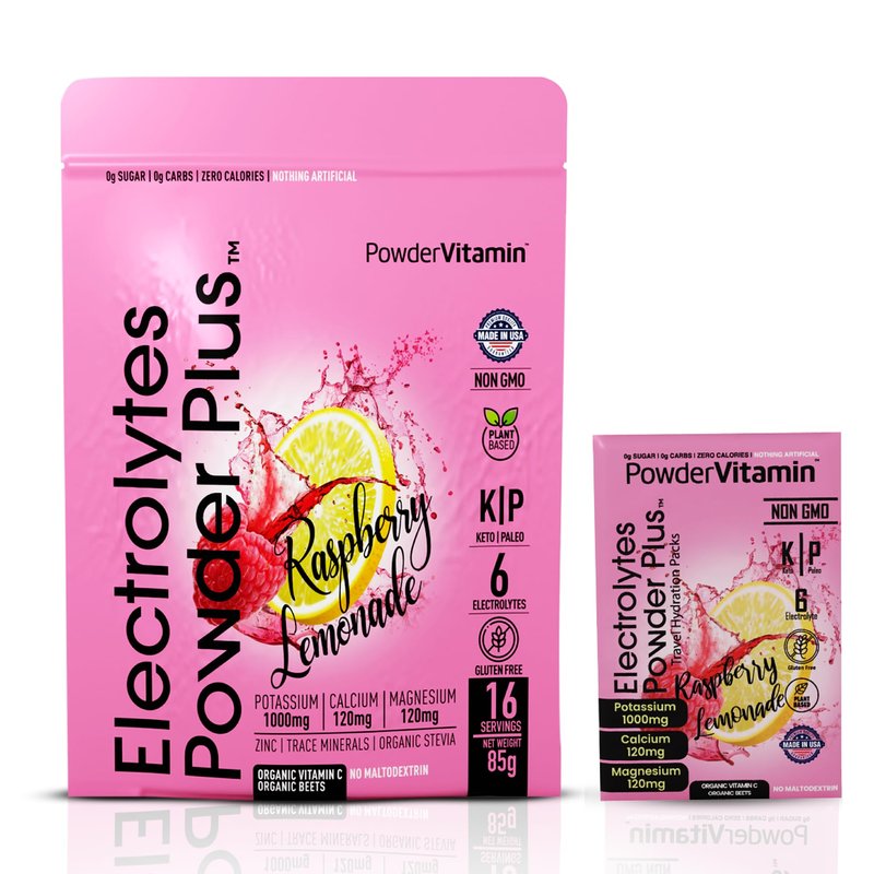 - Electrolyte Powder - Electrolytes Powder Plus contains 1000 mg of potassium opposed to only 250 mg in other brands. Additional we offer a unique flavor and blend of Magnesium, Calcium, Organic Pink Himalayan salt. Our delicious and hydrating blend of Raspberry Lemonade flavor includes 16 hydration packets for exercise, travel, or long nights. PowderVtmain Electrolytes Powder plus travel hydration packets has you covered.