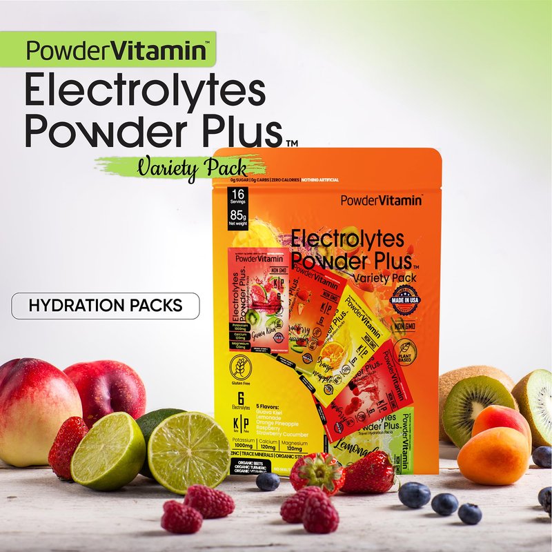 - Electrolyte Powder - Electrolytes Powder Plus contains 1000 mg of potassium opposed to only 250 mg in other brands. Additional we offer a unique flavor and blend of Magnesium, Calcium, Organic Pink Himalayan salt. Our delicious and hydrating blend of Variety Pack A flavor includes 16 hydration packets for exercise, travel, or long nights. PowderVtmain Electrolytes Powder plus travel hydration packets has you covered.