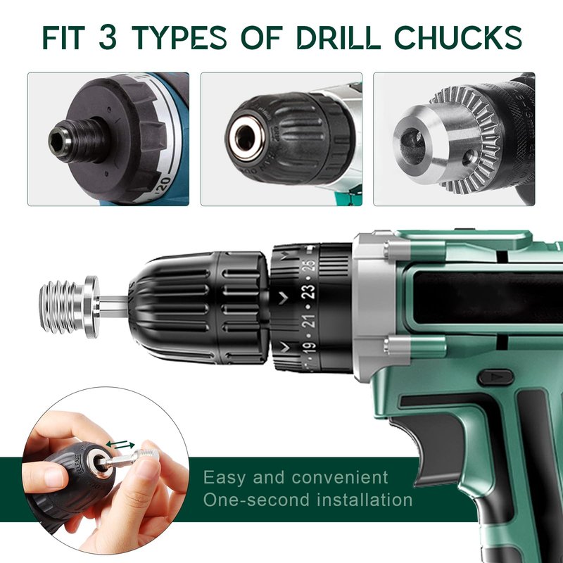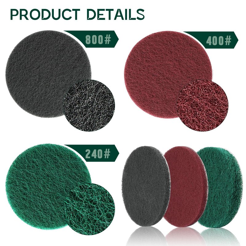 15 PIECES SCRUB PADS: Includes 7 5" red scrub pads, 3 5" gray scrub pads and 2 5" green scrub pads (three level of stiffness), a long 6 inch reach attachment, 5 inch hook and loop backing pad and 1 universal shaft. Drill not included.