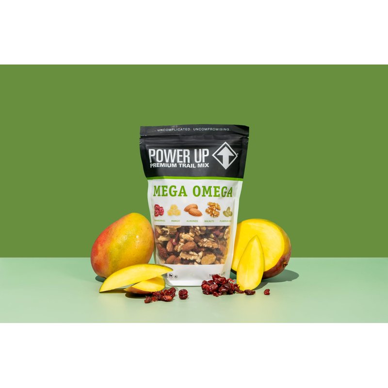 - Our Mega Omega trail mix is perfect for on-the-go snacking. You can also top our delicious trail mix on your salad, oatmeal, or yogurt. Make POWER UP a part of your next adventure!