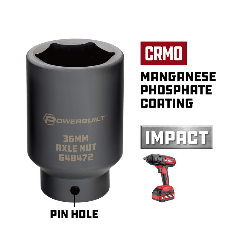 Powerbuilt 1/2-inch Drive Axle Nut Socket, 36mm 6 Point Extra Deep, Remove Front Wheel Drive Axle Shaft Nuts, Pin Hole - 648472, Black