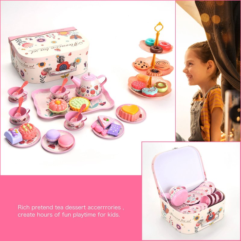 PowerTRC Tea Set for Little Girls, 48 Pcs Princess Tea Party Set for Toddlers 3 4 5 6 7 8 Years Old Girl Pretend Toys Birthday Gift with Tin Tea Set, Utensils, Desserts & Carrying Case