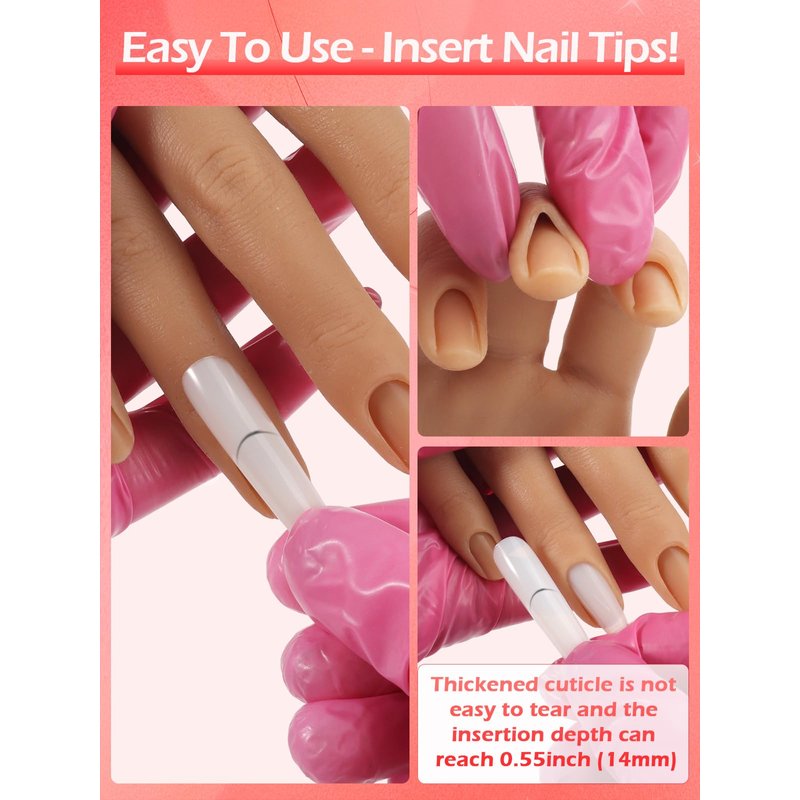 - 【Easy To Use - Insert Nail Tip】:Silicone practice hand mannequin upgrades the nail bed , increasing the thickness of the cuticle to prevent the cuticle from being damaged during use. You can insert the nail tips directly into the 14 mm nail bed pocket without using glue to stick the nail. Then you can design and paint nail art patterns on nail tips. Suitable for nail art beginnings and nail salon artists.