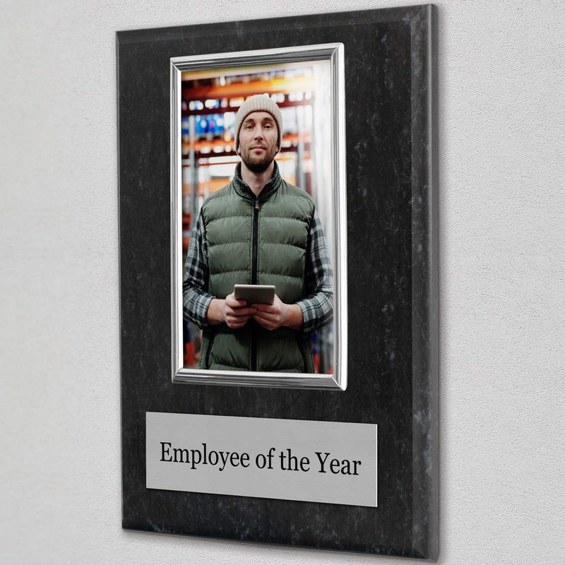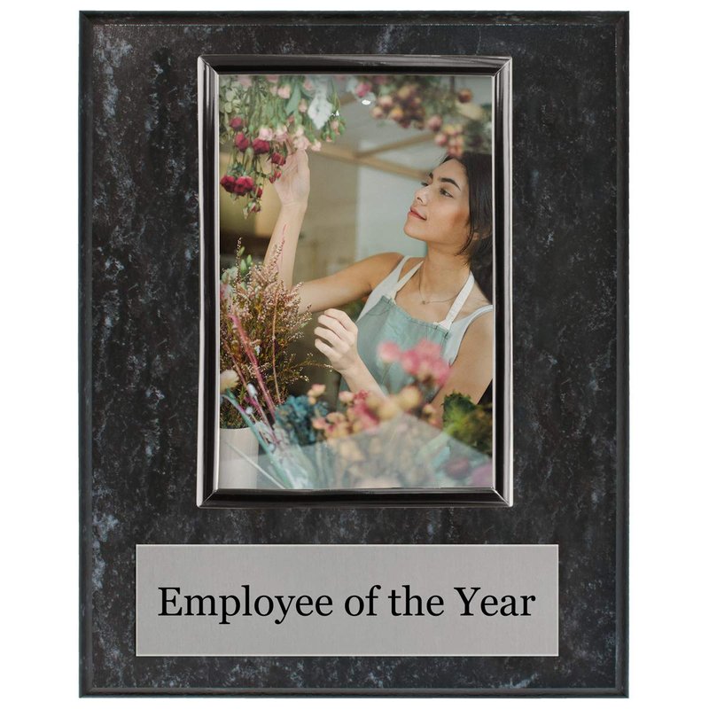 Show your employee's just how much you appreciate the good job they are doing by honoring an employee each year with their very own employee of the year plaque. Once received, insert their photo and proudly display this plaque for everyone to see. The elegant coated marble plaque is 10 x 8" and holds a 6 x 4" photo. The frame holding the photo will be silver.