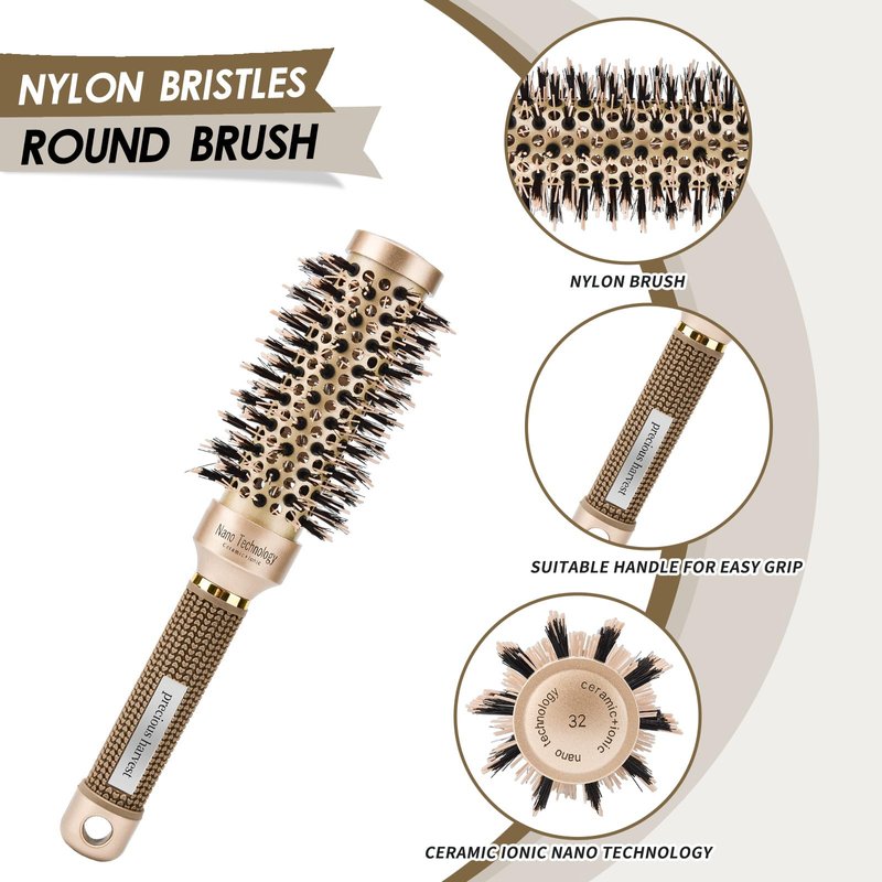 - [Product features] The round roller brush adopts hollow aluminum design, which can quickly conduct the hot air of the hair dryer to achieve the effect of internal and external heating, and the drying speed is faster and easier to do styling. Nylon comb teeth are soft and easy to enter the hair, not easy to fall out, high temperature resistance. The rubber handle is effective anti-slip and comfortable to handle