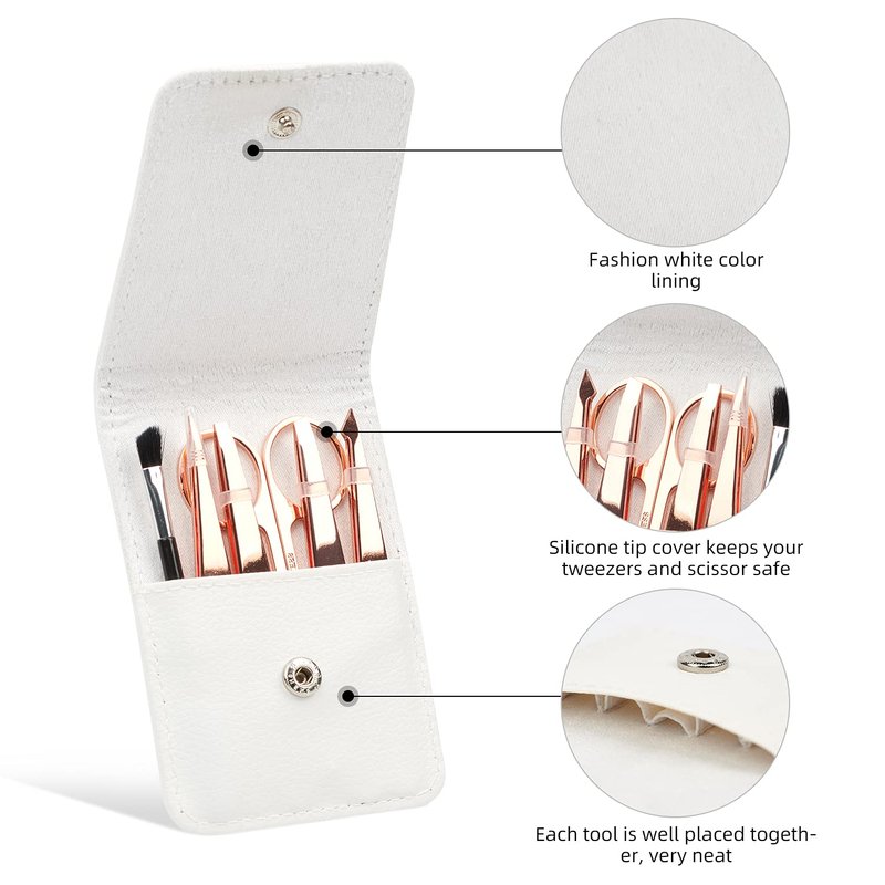 - 【Quality Tweezers Gift】The lightweight eyebrow scissors,brush and tweezers set comes with a delicate leather bag, which is very convenient for daily storage and carrying. The unique rose gold matches the leather case of the same color. Say goodbye to nasty stray hair with these precision tweezers. Similarly, the eyebrow tweezers kit is also a good gift for your wife/girlfriend/mother/daughter.