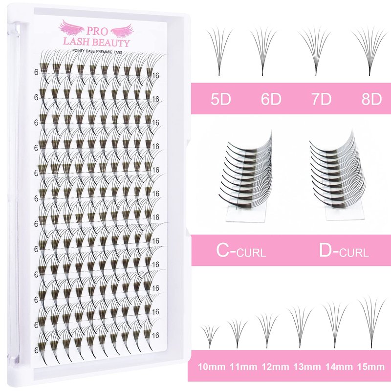 - Specification : Pointy Base Premade Fans Eyelash Extensions have regular and large trays that per regular tray has 120 fans and per large tray has 320 fans . Available in 3-14D , 0.05/0.07/0.10 , C and D curl , 9 to 16 mm single length and 9-16 mix length .