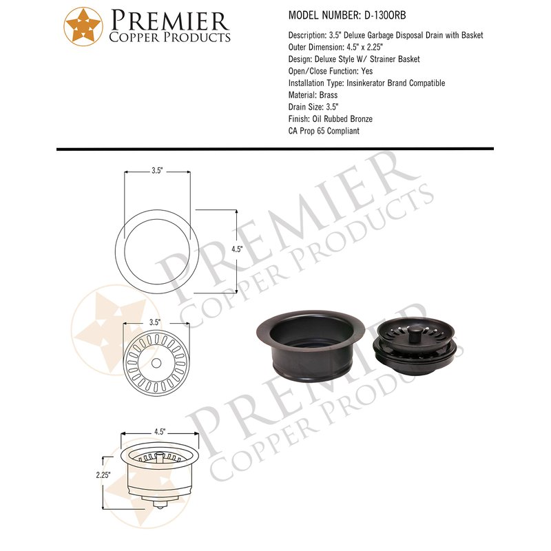 Premier Copper Products D-130ORB 3.5-Inch Deluxe Garbage Disposal Drain with Basket, Oil Rubbed Bronze