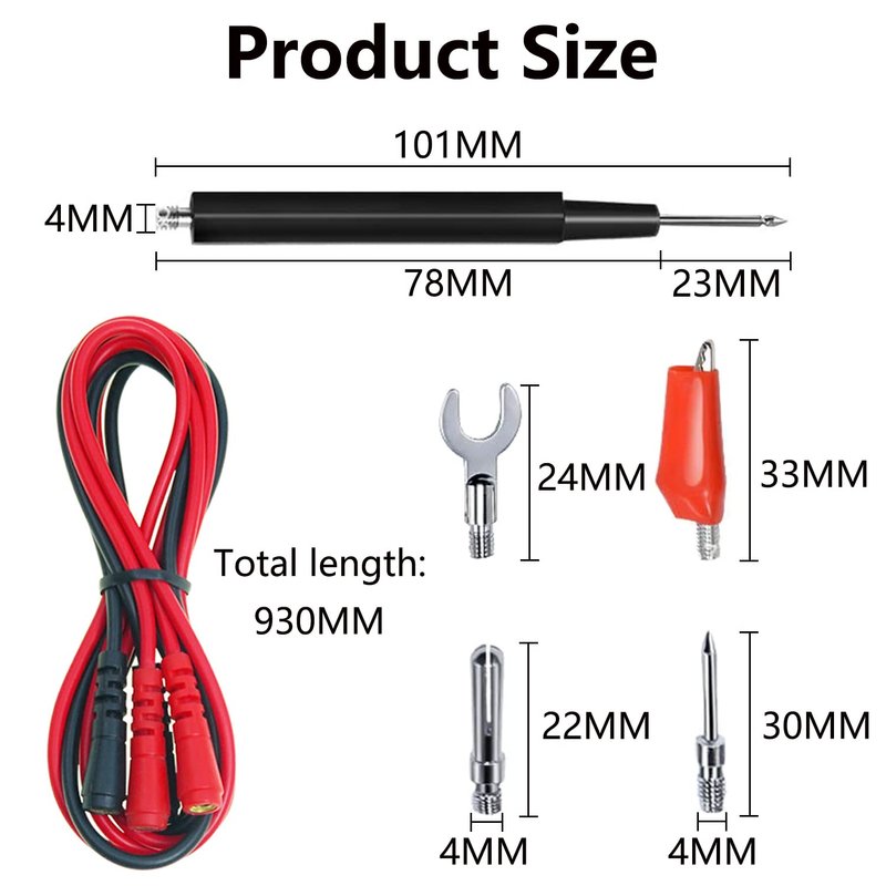 - Package Included -- There are 2 sets of 16-in-1 multimeter test leads kit with alligator clips electronical for the multimeter, including 4pcs test leads, 8pcs alligator clips, 4pcs power needle probes, 4pcs testing handles, 8pcs 4mm banana plugs, 4pcs spade plugs. 32 pieces in total. The overall length of the test leads is 930 mm / 36.6 inches. When getting this multifunctional multimiter test leads set, you can finish many electronical experiments. The is the alligator clips for multimeter.