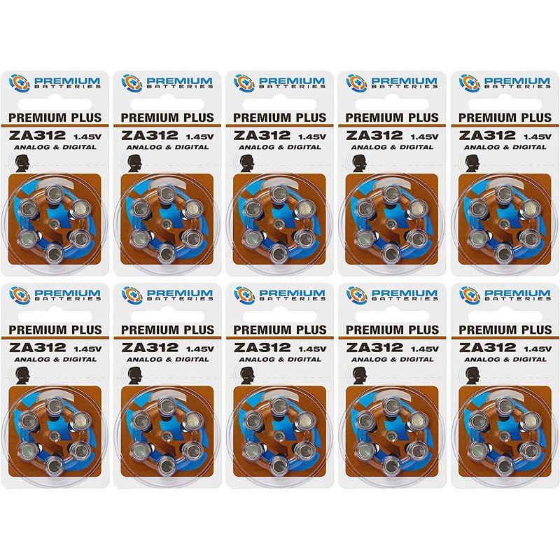 Premium Batteries Size 312, ZA312, PR41, P312 1.45V Zinc Air Hearing Aid Batteries Brown Tab (60 Batteries)