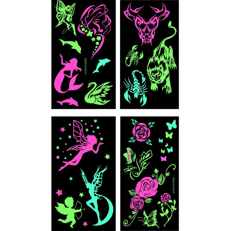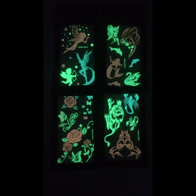 - NEW HOT Glow Tattoos - These aren't the same old Tattoos that you used to buy as gifts 1 years ago. This hot new Glow In The Dark Tattoos incorporates a generation's worth of ideas. Not to mention, they're waterproof. The all parts can glow in the dark after absorb sunshine Lamp Light and other light for 15 to 20 mins.