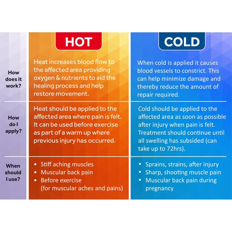 - THERAPEUTIC EFFECT: Cold therapy reduces swelling and pain caused by inflammation, and relieves discomfort associated with hip replacement recovery, joint & muscle injuries, hip & shoulder pain, stress fractures, growing pains, sunburn, arthritis, sports injury, post surgery pain & burns. Hot therapy relaxes tight muscles and restores flexibility in muscle pain & soreness, cramps, arthritis, hip and shoulder stiffness, menstrual cramps, sciatica, pinched nerves.