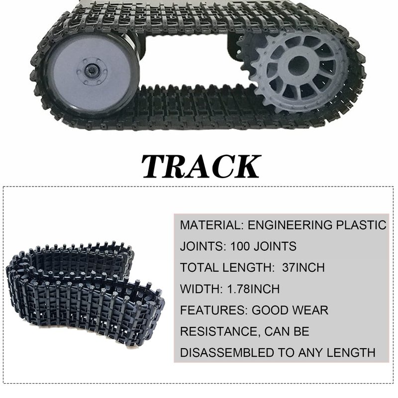 - TRACKED DESIGN-This robot car chassis adopts tracked design, which lead to the tank car chassis having strong obstacle avoidance ability, it can climb over most obstacles and is suitable for most terrains. And This track is made of engineering plastic, which basically ensures good elasticity, good damping effect and large grip of the product. Moreover, the length of track can be changed by adjusting the nunber of the track.