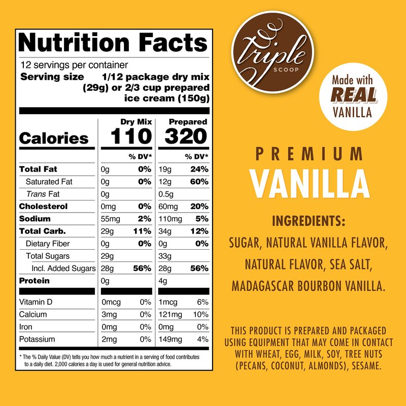 Triple Scoop mixes come in vanilla, chocolate, strawberry, mint chocolate chip, vanilla chocolate chip, mocha chip, and cake batter. Flavored with the finest ingredients possible: madagascar bourbon vanilla, guittard premium cocoa, rich columbian coffee, and real strawberries.