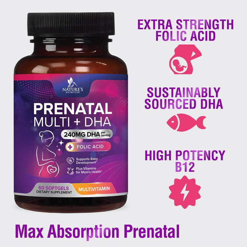 - Prenatal Multivitamin with DHA and Folic Acid: Nature's Nutrition Pregnancy vitamins for women folate omega 3 iron best womens advanced prenatals supplement pre natal post postnatal vitamin supplements 1 30 60 90 day supply hair growth support brain count choline free liquid gummies gummy pills new one nature pastillas prenatales made para embarazadas pregnant vitaminas c
