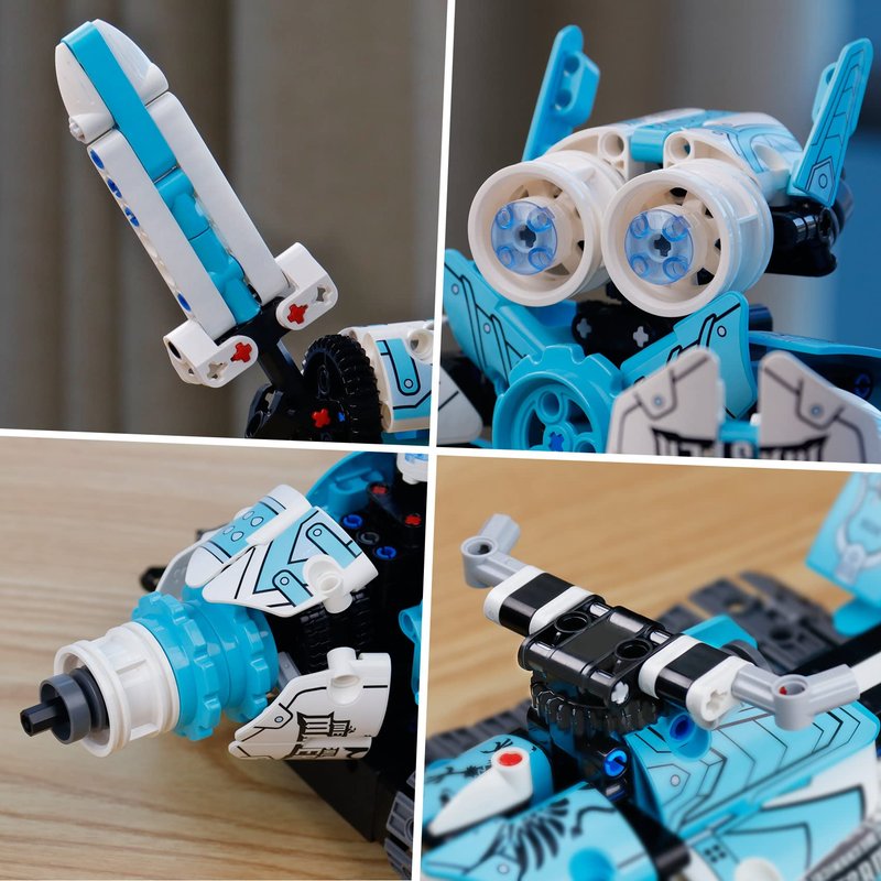 - 【Explore Robotics with 3 in 1 Building Set】398 pieces, kids will build a robot that holds weapon and a shield, also rebuild into a tank or a on-road motorboat. Then let it go forward, reverse, turn, omni-angle spin and show off indoor.