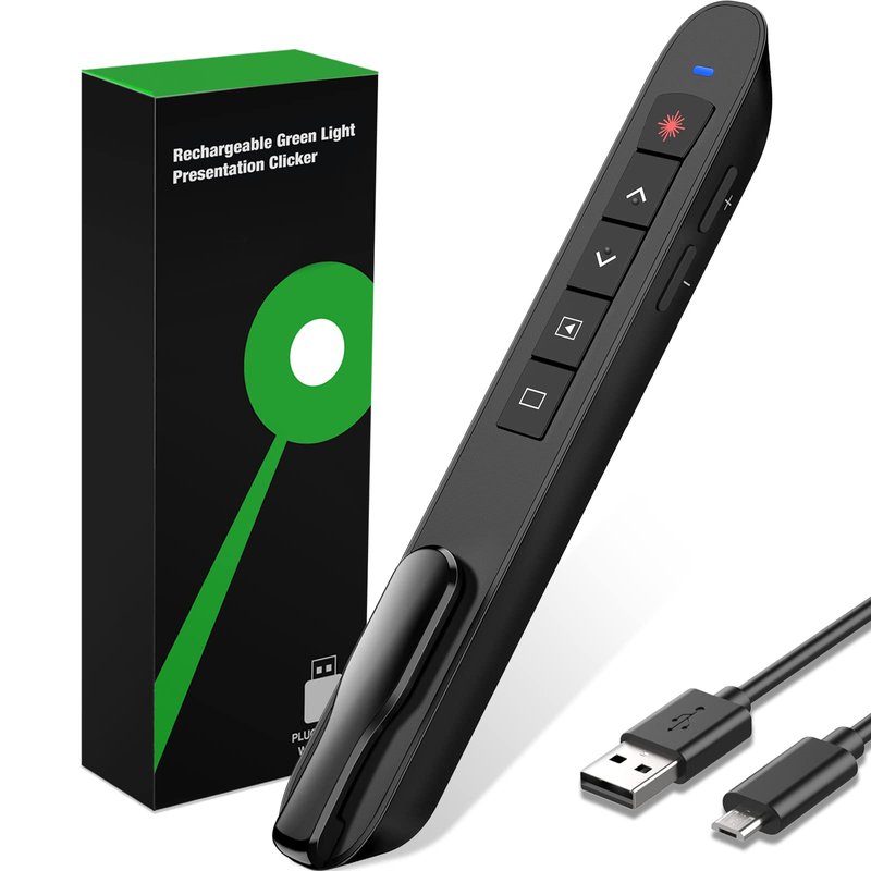 Presentation Clicker Green Laser Pointer, Rechargeable PowerPoint Clicker Wireless Presenter Remote, RF 2.4GHz USB Presentation Pointer Slide Advancer with Hyperlink Volume Control for Mac Computer