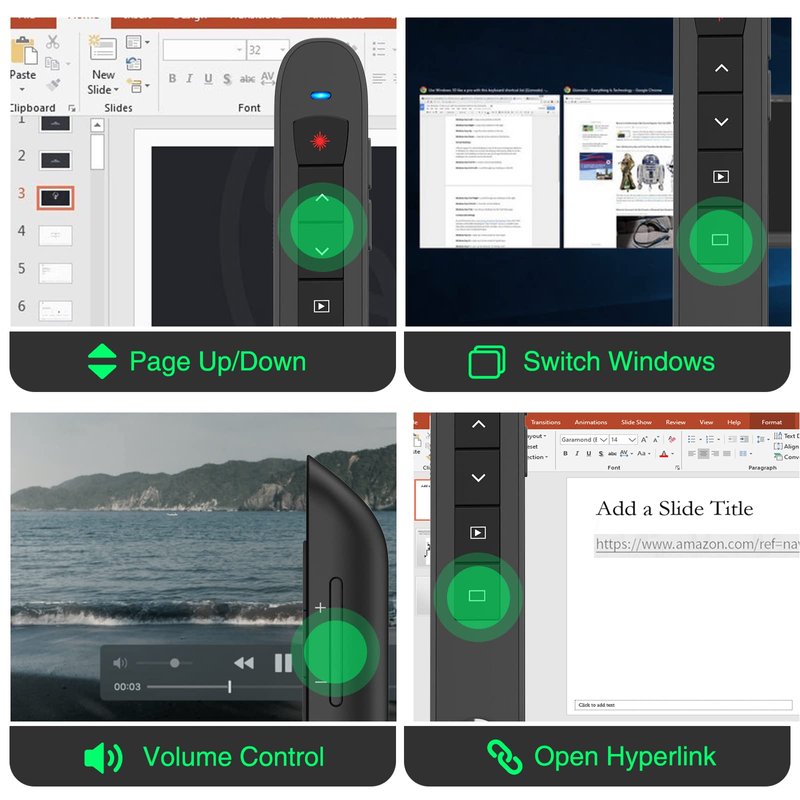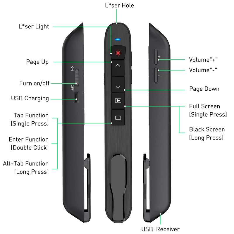 - 【Multi-features Rechargeable PowerPoint remote】Laser Pointer Rechargeable Presentation Remote serves all the basic functions via the press and double-press and hold features of page up/down, full/black screen, hyperlink, volume control, switch windows. Laser pointer Pen built-in 360mAh Lithium Battery, projector clicker only requires 1H full charge support weeks use