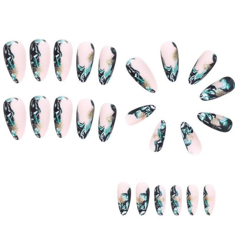 Press on Nails Almond Green Smudge False Nails Designs Medium Long Acrylic Nails Glossy Fake Nails Artificial Glue on Nails for Women 24 Pcs / 12 Size