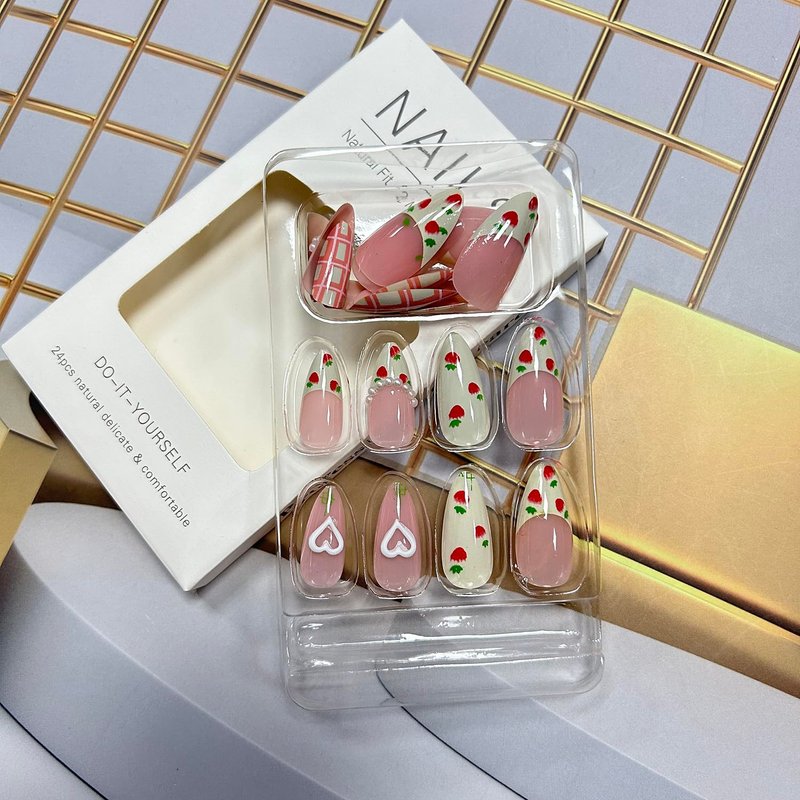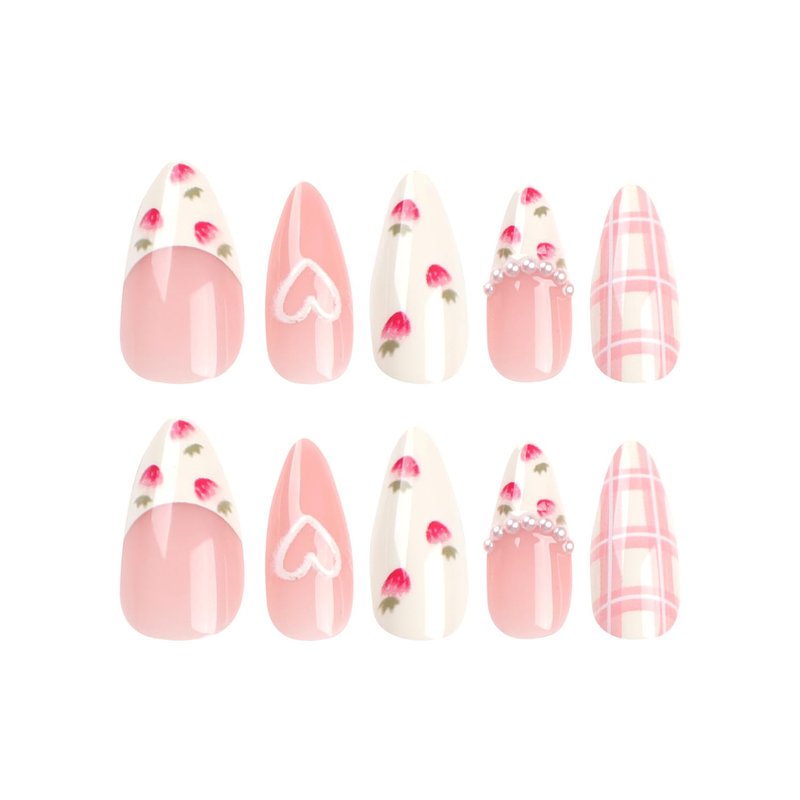 Press on Nails Long Almond Love Heart Strawberry False Nails Chain of Pearls Design French Fake Nails Artificial Acrylic Nails Full Cover Glossy Reusable Coffin Nails Glue on Nails for Women 24Pcs