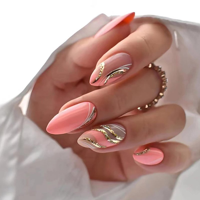 - Easy to Use: Artificial fingernails with glue sticker can get your favorite manicure in just 5 minutes without waiting at the nail salon. Golden ripple nails with shine give you more beautiful, pink also can have you cute and sweet. Some simple steps allow you to get the same impressive professional effect at home.