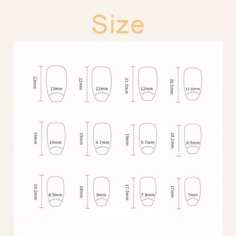 - 【Package】: There are 24pcs of short coffin artificial finger nails 12different sizes, 1 mini nail file, 1 small wooden stick, 1 nail sticker in the package.(Jelly glue doesn't last as long as liquid glue, but it can make fake nails reusable. Please use suitable glue according to different occasions).