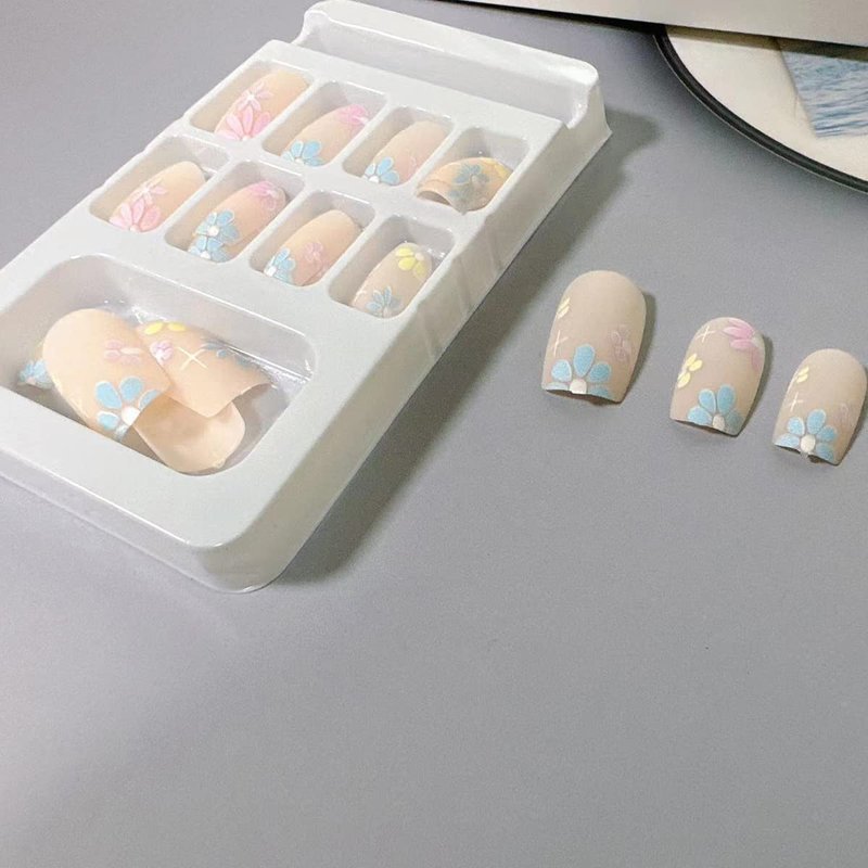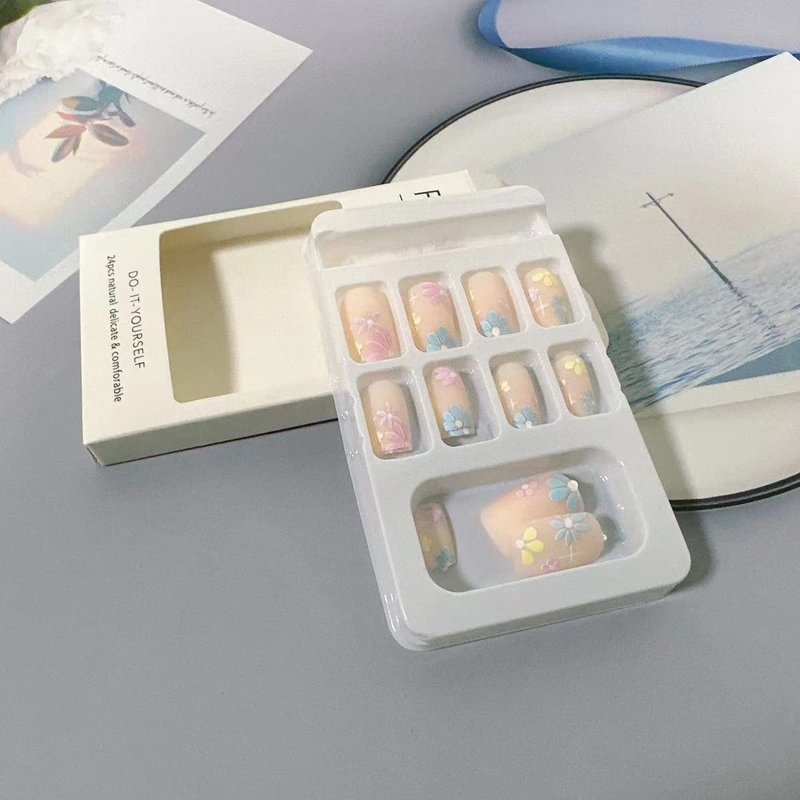 - Flower nail art:1Box 24 Pcs short fake nails, with 24 pieces of jelly glue,1 piece of alcohol cotton, 1 mini nail file, 1 wooden stick.there are different 12 sizes of false nails, which are suitable for fingernails of various sizes.