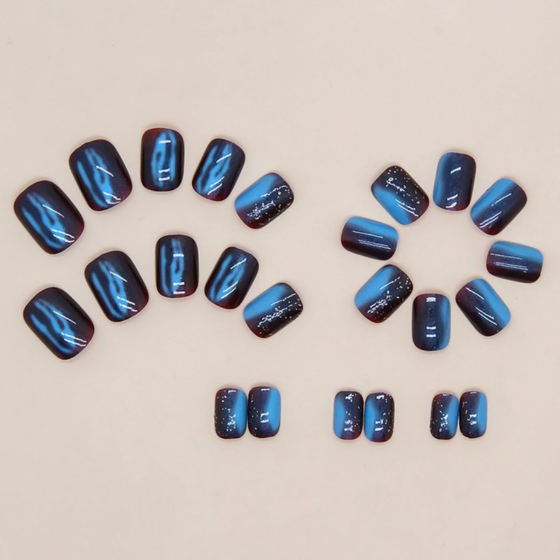 24Pcs Press on Nails Short, Galaxy Blue Acrylic Glossy Fake Nails Set for Women Manicure Decorations.