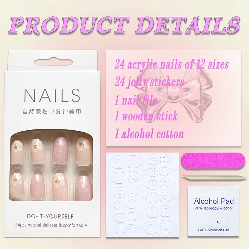 - 【Package Content】You will get 24 round acrylic nails of 12 sizes, 1 nail file, 24 jelly stickers, and 1 wooden stick for removing false nails.