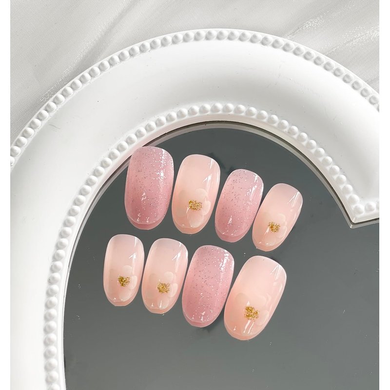 Press on Nails Short Round MABKJLF Fake Nails Pink Full Cover Foil Flower False Nails with Designs Glitter Glossy Glue on Nails Acrylic Nails Artificial Nails for Women Girls 24 Pcs