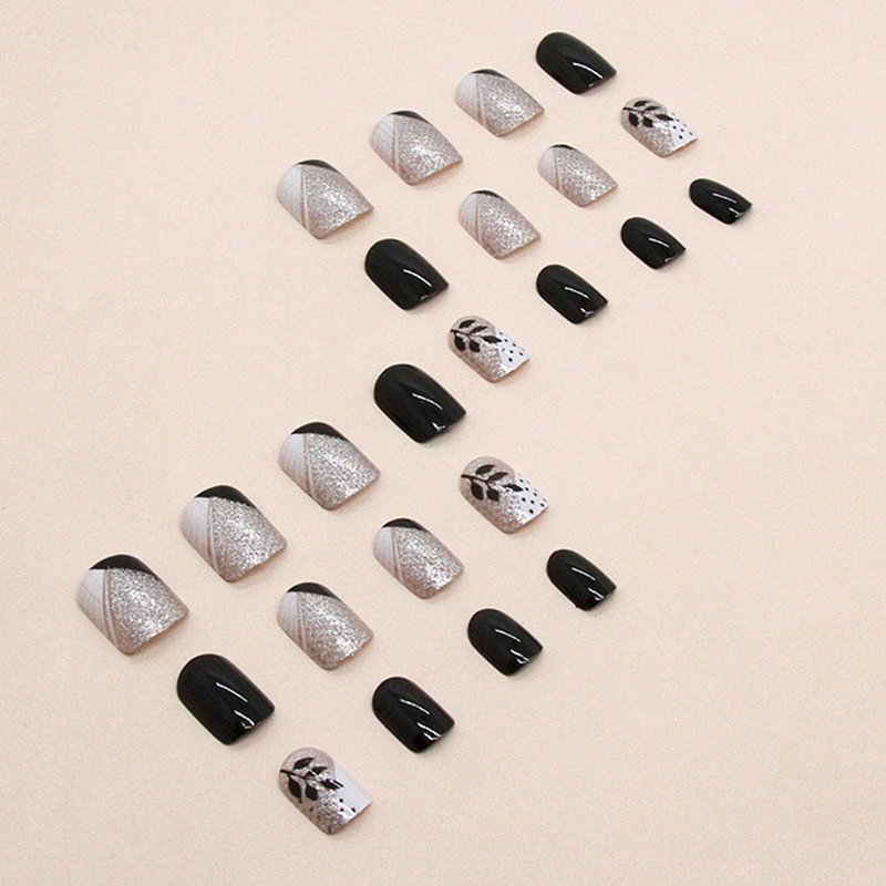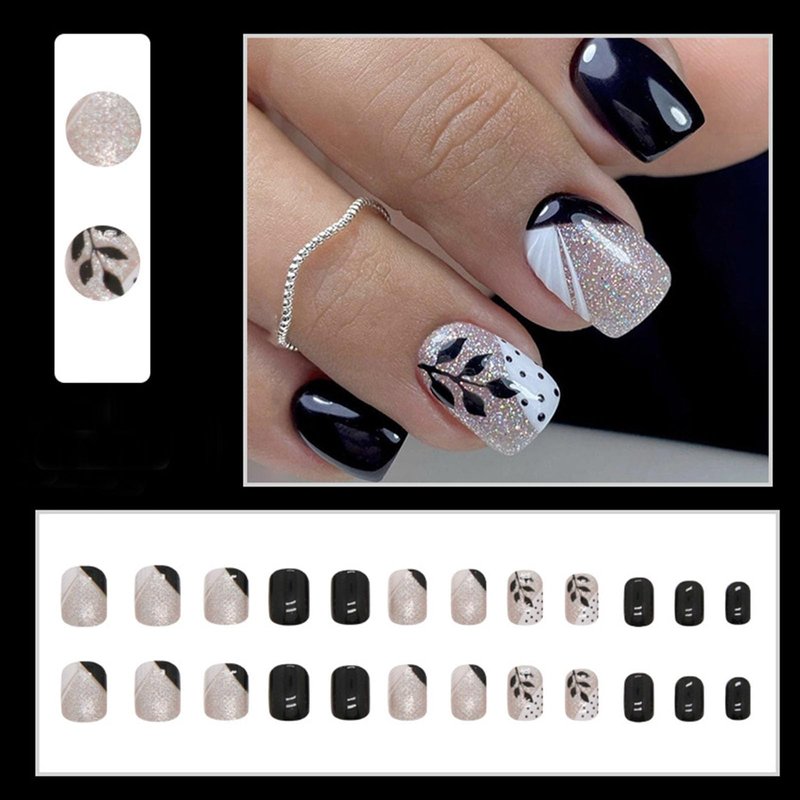 Press on Nails Short Square Fake Nails Black White French Tip Acrylic Nails with Black Leaves and Polka Dots Designs Glitter Full Cover Glossy Black False Nails Stick on Nails for Women 24Pcs