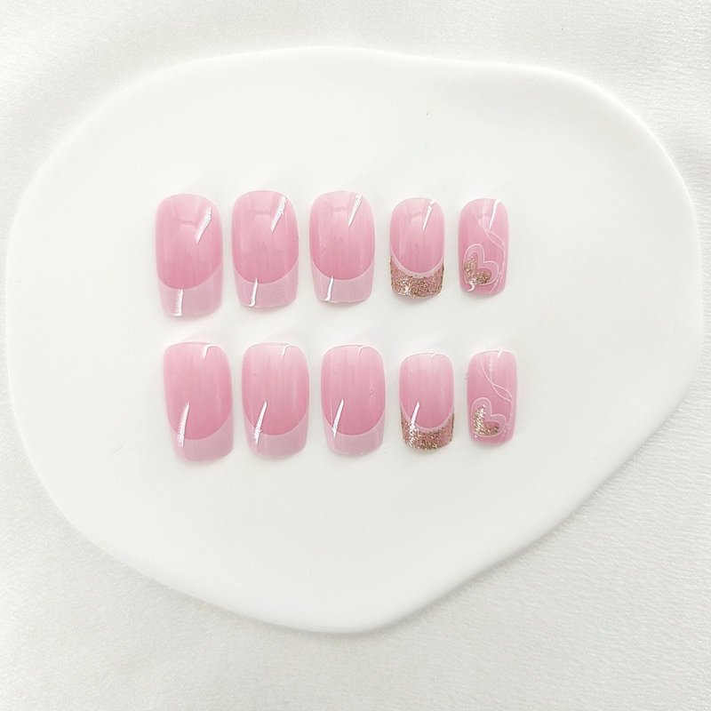 Press on Nails Short Square Fake Nails White French Tip Acrylic Nails Pink Full Cover False Nails Heart & Gold Glitter Glue on Nails Swirl & Glossy Nails for Women 24 Pcs