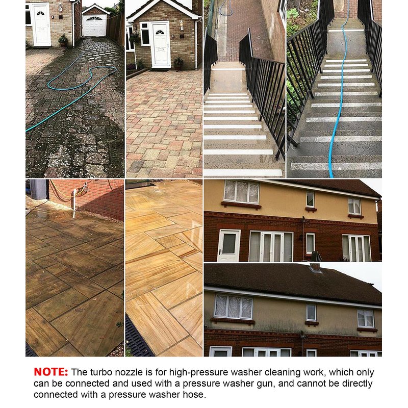 - 【Save Time】These Power Washer Turbo Nozzle help in reducing cleaning time by utilising the rotary action of an 0° stream and a wide angle spray pattern, They are designed to provide a 200% cleaning efficiency over conventional fan jet nozzles. Attention: When you find the nozzle can not work for a long time.1.Pls disassemble the nozzle, ,clean the inside thoroughly. 2.It will also not work normally, If there is no enough water,release the gas after you add water.