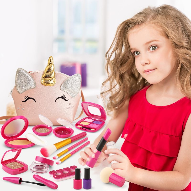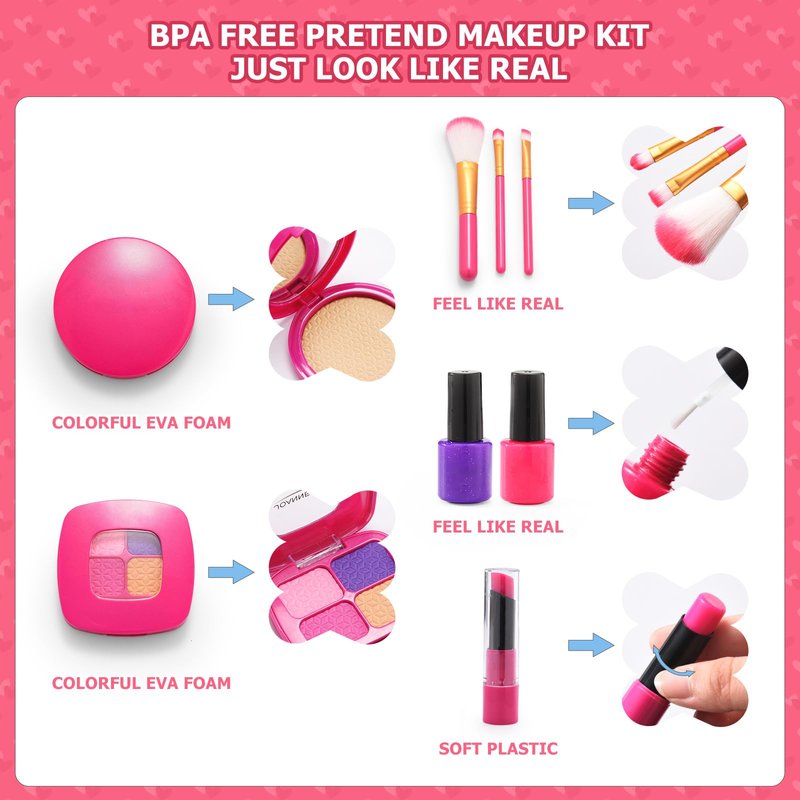 - UNIQUE GIFT IDEA: The fashionable design of this play makeup for little girls will satisfy every girl's wish to be a little pretty princess. Keep your little girls busy for hours and encourage grooming habits and stir creative play. packed in exquisite gift box, perfect Christmas gift choice